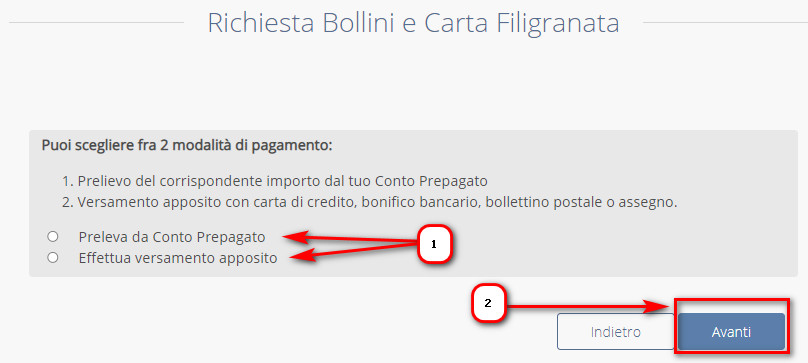 Selezionare la modalità di pagamento che si desidera utilizzare per l’acquisto del materiale (1) e proseguire AVANTI (2):