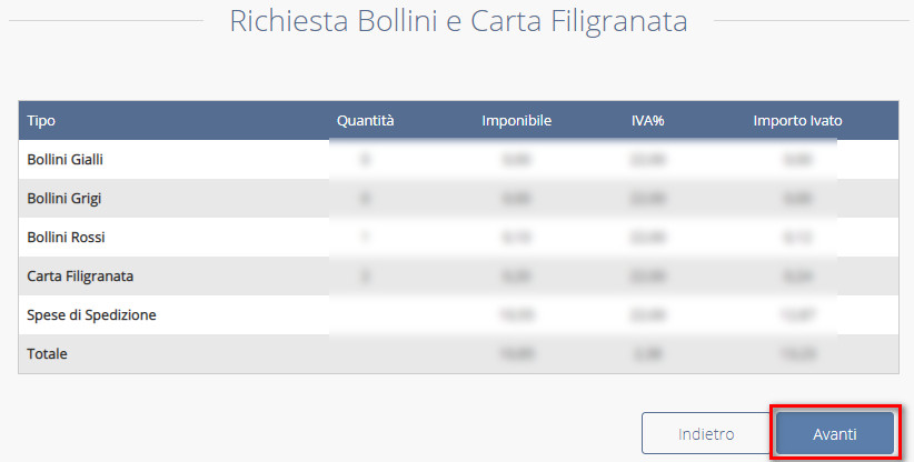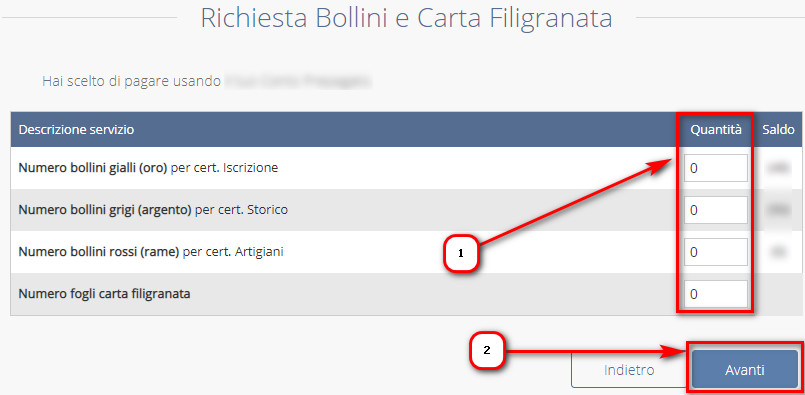 Indicare la quantità di bollini e carta filigranata che si desidera acquistare (1) tenendo conto che, per ogni certificato deve essere apposto un solo bollino ma andrà stampato sulla carta filigranata e non si potrà sapere, prima di procedere all’estrazione, di quante pagine è composto il certificato estratto. Al termine, proseguire AVANTI (2):