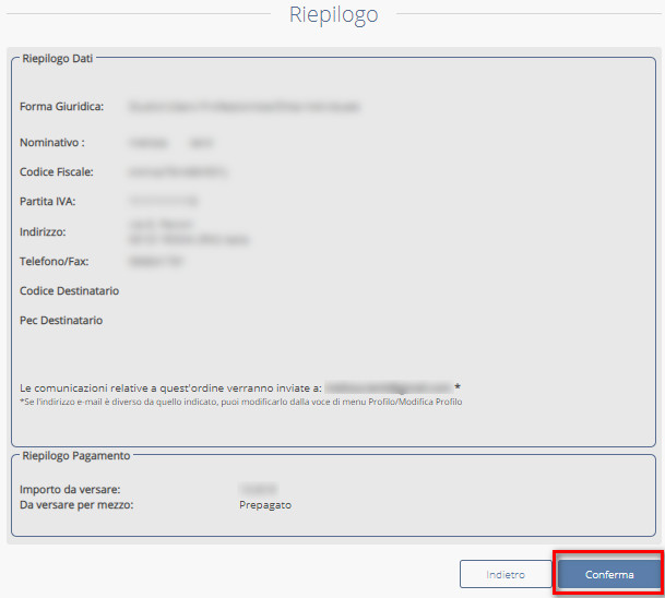 Proseguendo avanti, si visualizzerà il riepilogo del pagamento e, cliccando su CONFERMA il sistema in automatico addebiterà il costo del materiale scelto: