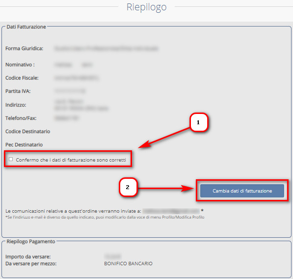 Nella schermata successiva, il sistema mostrerà i dati di fatturazione. Se quest’ultimi sono corretti, basterà selezionare la voce “Confermo che i dati di fatturazione sono corretti” (1), qualora fossero errati, cliccare sul tasto “Cambia i dati di fatturazione” (2):