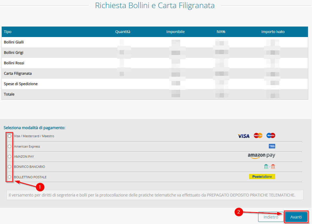Qualora come modalità di pagamento fosse stato scelto EFFETTUA VERSAMENTO APPOSITO, nella schermata con il dettaglio dell’acquisto il sistema chiederà di selezionare anche la modalità di pagamento (1) che si desidera utilizzare, successivamente, proseguire AVANTI (2):