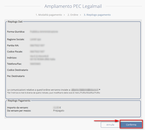 Nella pagina successiva, cliccando su CONFERMA, si concluderà la procedura di pagamento:
